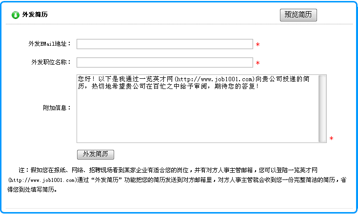 2) 在打開的頁面中,輸入接收企業的Email地址、應聘的職位名稱以及您的其它要求后,點擊"發送簡歷"按鈕就可以了。如下圖所示: